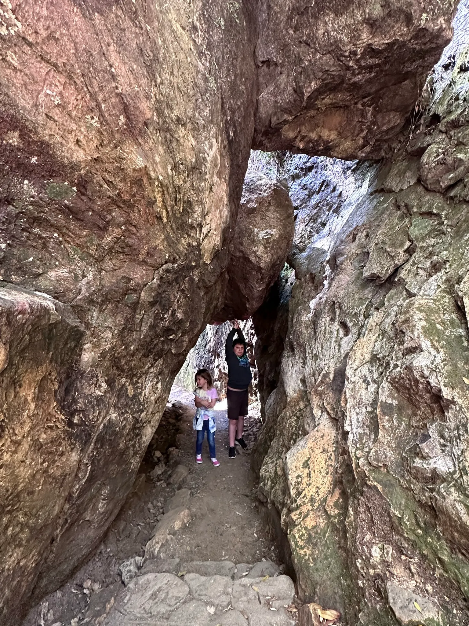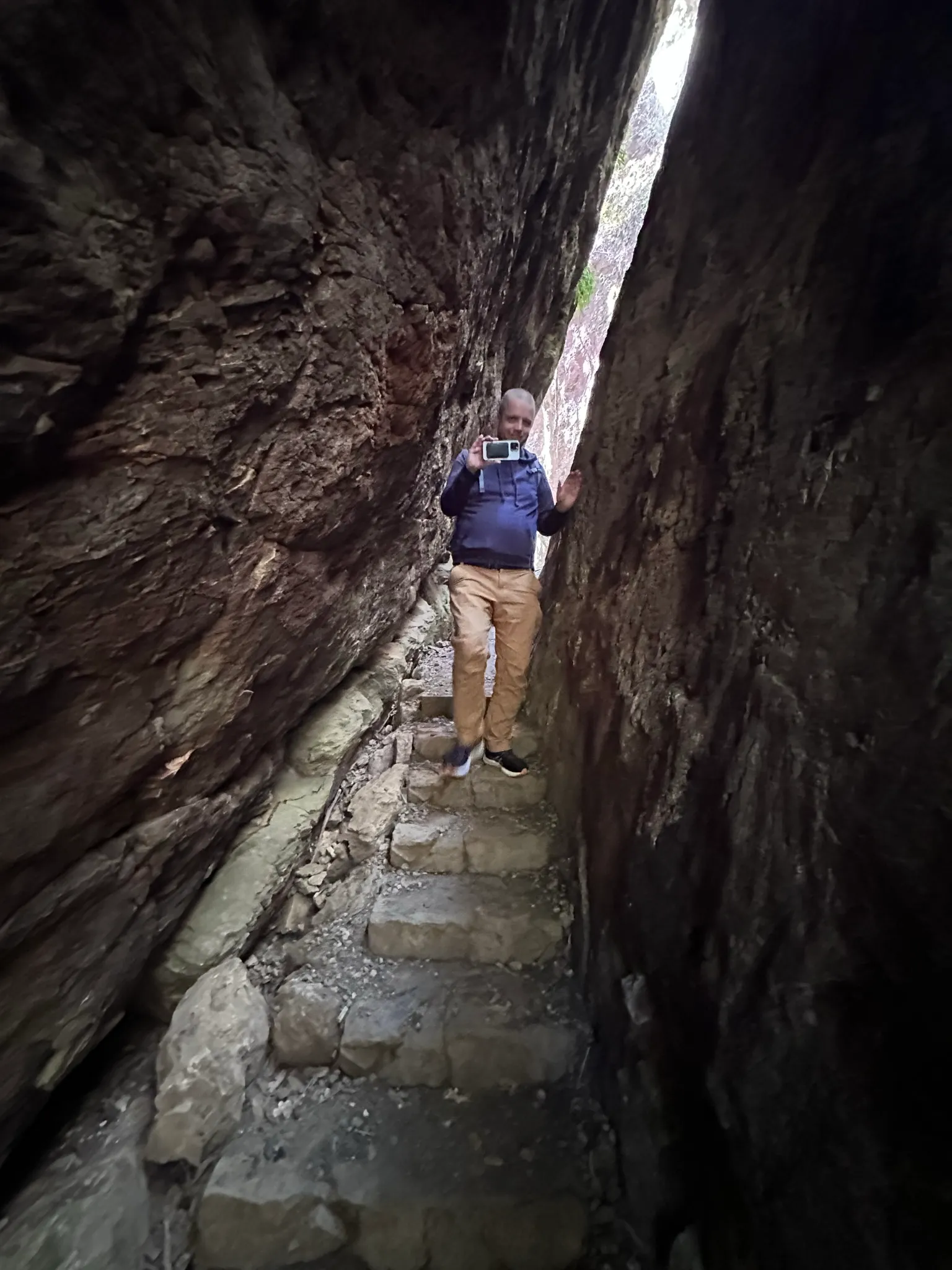 Innen folytattuk az utunkat tovább lefele a hegyen, amikor is rájöttünk, hogy mivel plusz egy órával hosszabban utaztunk, a tervünk ,hogy majd a túra után eszünk a helyi kis kávézóban nem rossz, csak épp mindenki rettenetesen éhes kezdett lenni. Volt nálunk par, de nem sok ennivaló amit meg is ettek. Gyerekek, de arra nem volt elég, hogy a teljes körútra megtegyük, ami meg kétszer ugyanannyi táv lett volna, viszont a nagyja lefele, majd meredeken visszamászva. Szóval úgy döntöttünk Mátéval, hogy inkább visszafordulunk, az a tuti. Majd a természettől kaptunk egy kis adrenalin lökést, mivel a fal / szikla/ fák omlani kezdtek es gurultak lefele felénk. Én elől mentem a lányokkal, akiket a falhoz löktem, de hallottam, hogy nem a mi irányunkba gurulnak, hanem Máté es Gergő magasságában omlik a fal.